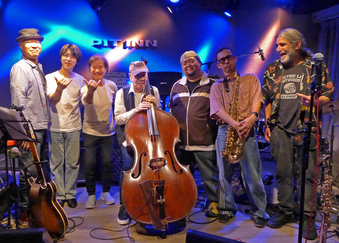 順に:羽仁 知治 (keyb)、山崎 隼 (ds)、 増尾 好秋 (g)、中村 照夫 (b)、鈴木 励一 (turntable)、中根佑紀 (sax)、Joe Berger (g)